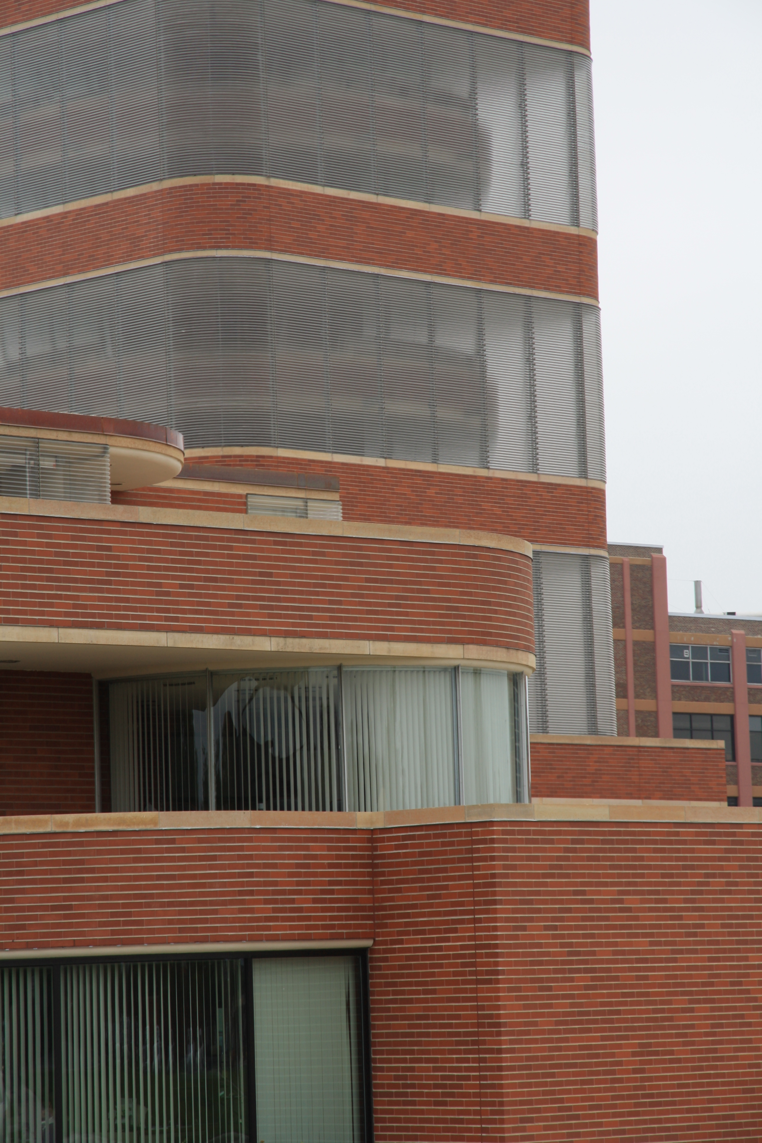 The first was Wright’s fascination with the automobile and his naiveté about how it would change the American landscape. The headquarters design is quite literally built around the vehicular procession along the side and into a long, low auto drop off. Dendriform columns that were Wright’s signature structural innovation for the building line the way. It’s like a squashed Egyptian temple, yet impressive. Amusingly, this grand entrance is lined with parking spaces. Wright carried this “carport” under low wings that wrap the courtyard out of which rises the research tower.